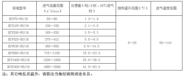 选型时,首先确定压缩机入口蒸发温度,由蒸发温度确定1吨蒸发体积流量,然后再换算为进口体积流量,根据体积流量选出型谱表中相应机型。 标准机型入口蒸发温度为85℃,从图表中得到1吨蒸发的体积流量为47.8 m3/min。