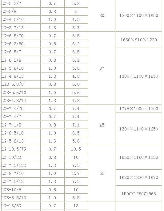 四、 全面符合甚至超越GB19153-2003《容积式空气压缩机能效限定值》国家标准的要求。 LG系列电动固定螺杆式空气压缩机技术参数 |